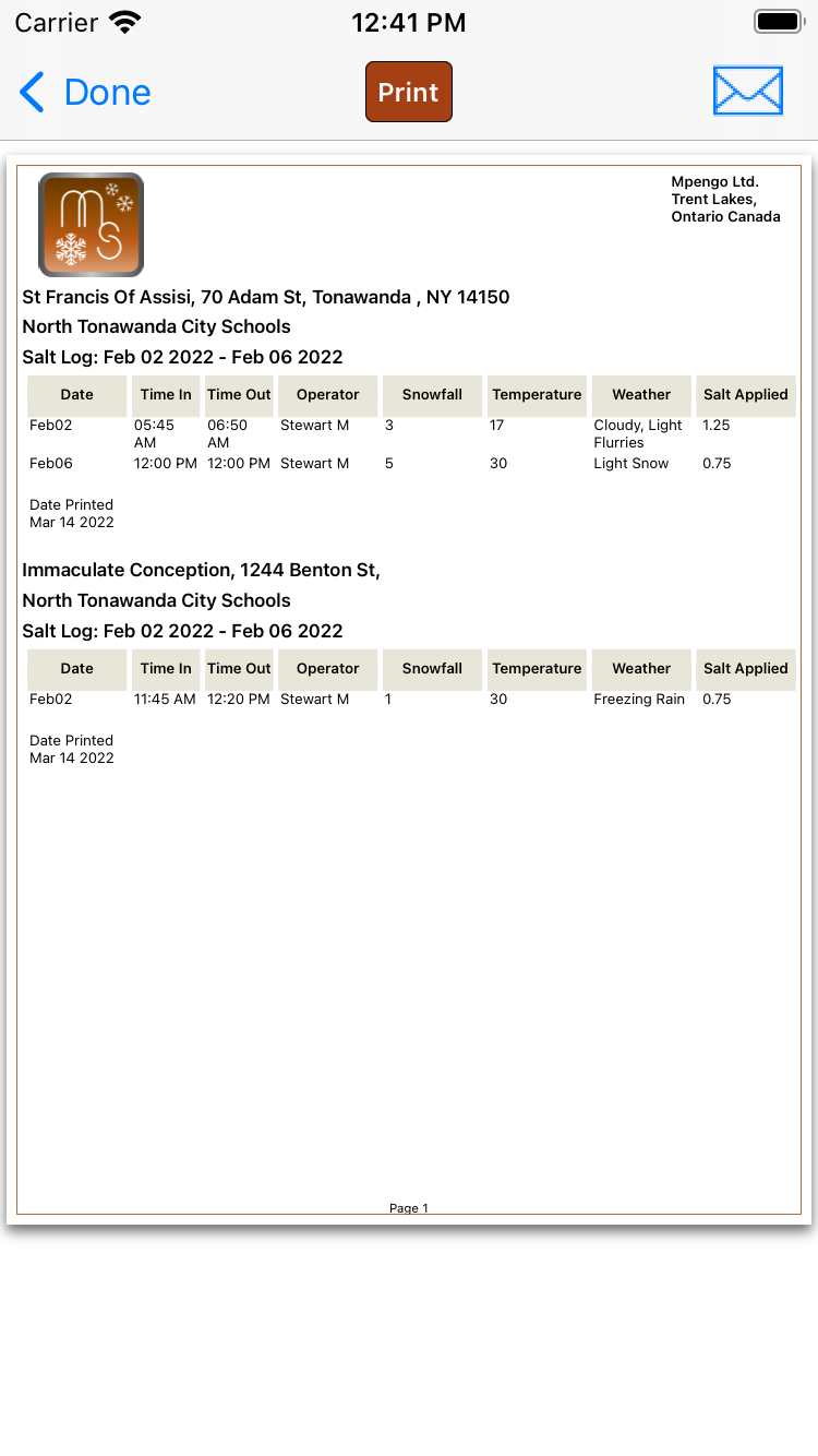 - Send salt logs and reports to clients for any period – daily, weekly, or monthly – providing an invaluable record for property managers, commercial property owners, insurance adjusters, and landscapers with snow removal crews